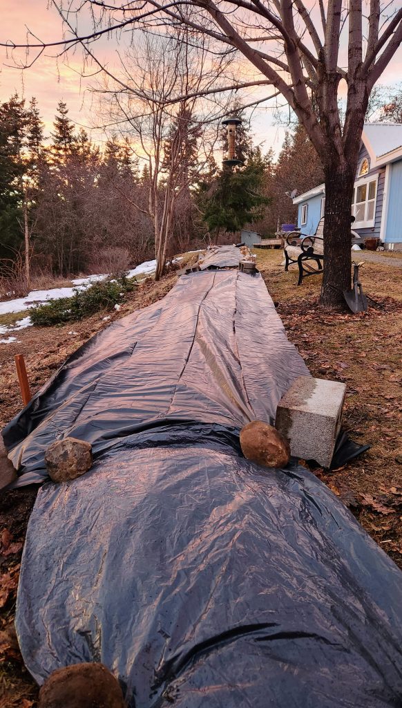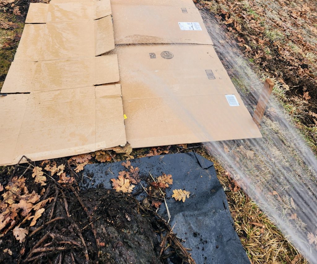 Food costs are up! You can grow your own food without much work, in a small space, and using inexpensive materials. Here’s the best part: no digging at all! That’s right! No digging! Using cardboard, leaves, organic compost, and dirt. Photos show the process of putting cardboard down right on top of the existing grass. Spray the cardboard with water. Then leaves, more water. Compost and dirt mixture, more water. Cover it up and let it sit until spring. So easy!