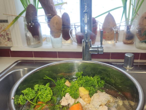 It’s still winter here. Yesterday was a perfect day to stay in and make a big batch of chicken bone broth. This morning, we woke up to 11 inches of snow and 11 degrees. Tim and Benjamin jumped up and went out to make sure the chickens and goats are doing well. Using a deep bedding system keeps these little creatures alive and healthy! They literally have about 16 inches of straw and wood chips in their pens. Instead of our normal cleaning, we actually leave the manure in place because composting manure generates heat. Two months ago, our egg supply diminished when the cold, cloudy days hit. Tim took the wood off the south side of the chicken coop and replaced it with greenhouse siding. Within 4 days, our girls were laying again!