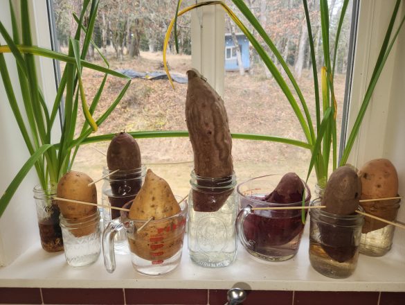 An easy and beautiful way to bring your grocery bill down while adding nutrient rich food to your diet is by growing what is called sweet potato slips. Simply put organic sweet potatoes in a little water and the potatoes will sprout then grow green, leafy vines. The leaves are edible and packed full nutrients! Keep them in your window sill to add to your salads, smoothies, or just to munch on! Another option is to pluck a foot long vine off of the potato, stick it in water and the vine will grow strong roots. When the weather has been in the high 70’s for at least several weeks, plant the rooted vines in your garden. The vines will go crazy! Adding beauty, rich food from the leaves and the potatoes, and biomass to enrich your soil. How can you go wrong with growing sweet potato slips? Try it!